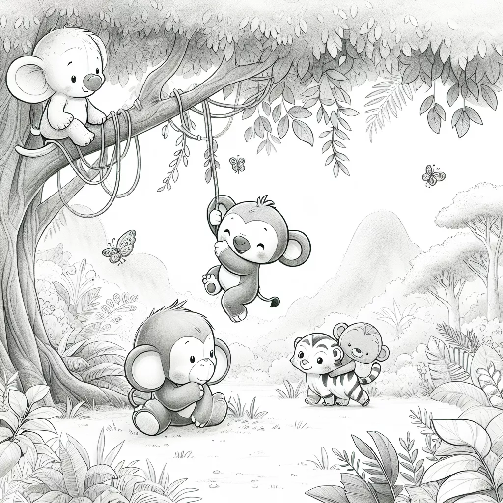 Abenteuer im Dschungel mit spielenden Tieren * Ausmalbild zum Ausdrucken » Zumipic | Zumipic