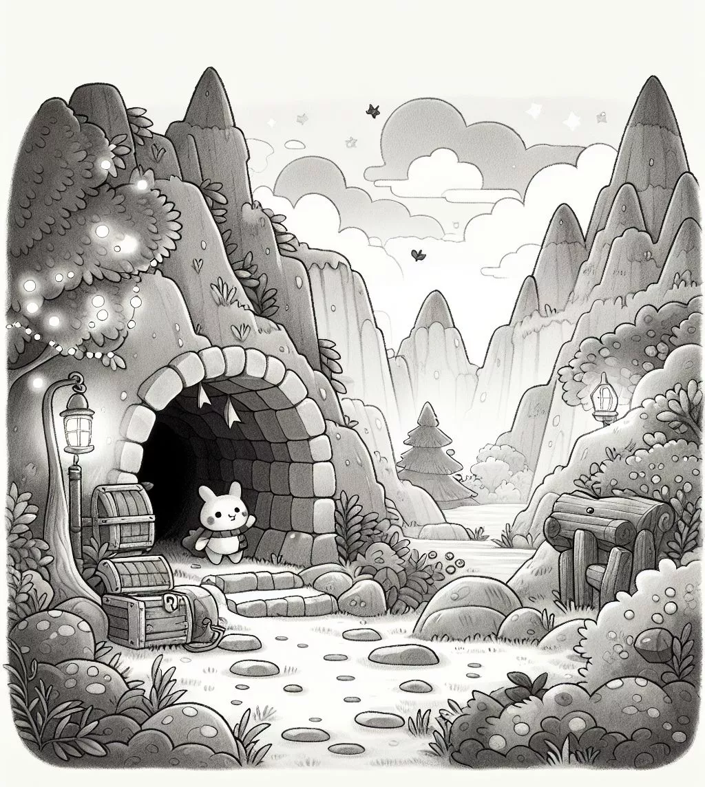 Ausmalbild zum Ausdrucken von einer geheimnisvollen Höhle und einem Schatz in den Bergen » Zumipic | Zumipic