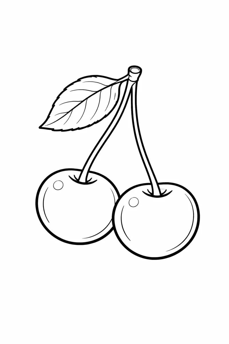 Diese einfache Kirschen-Malvorlage für Kinder zeigt zwei schlichte Kirschen, die durch einen Stiel verbunden sind, gestaltet mit kräftigen Konturen und großen Flächen, die perfekt für Kleinkinder und Vorschulkinder sind.
