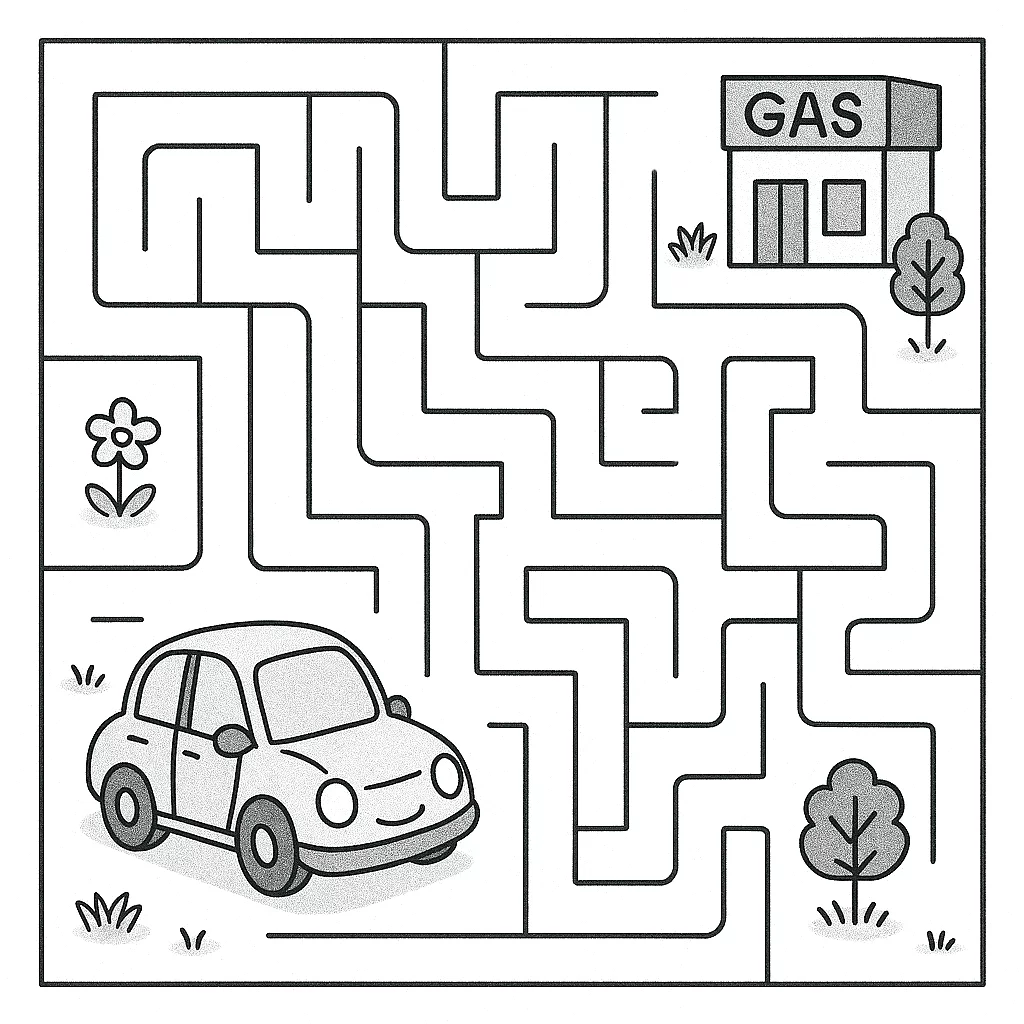 Finde die Tankstelle – Labyrinth mit Auto zum Ausmalen