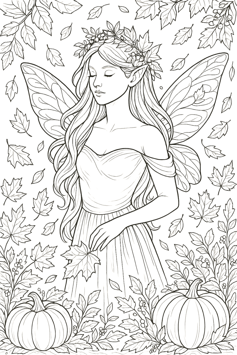 Malvorlage einer Herbstfee zwischen fallenden Blättern » Zumipic | Zumipic
