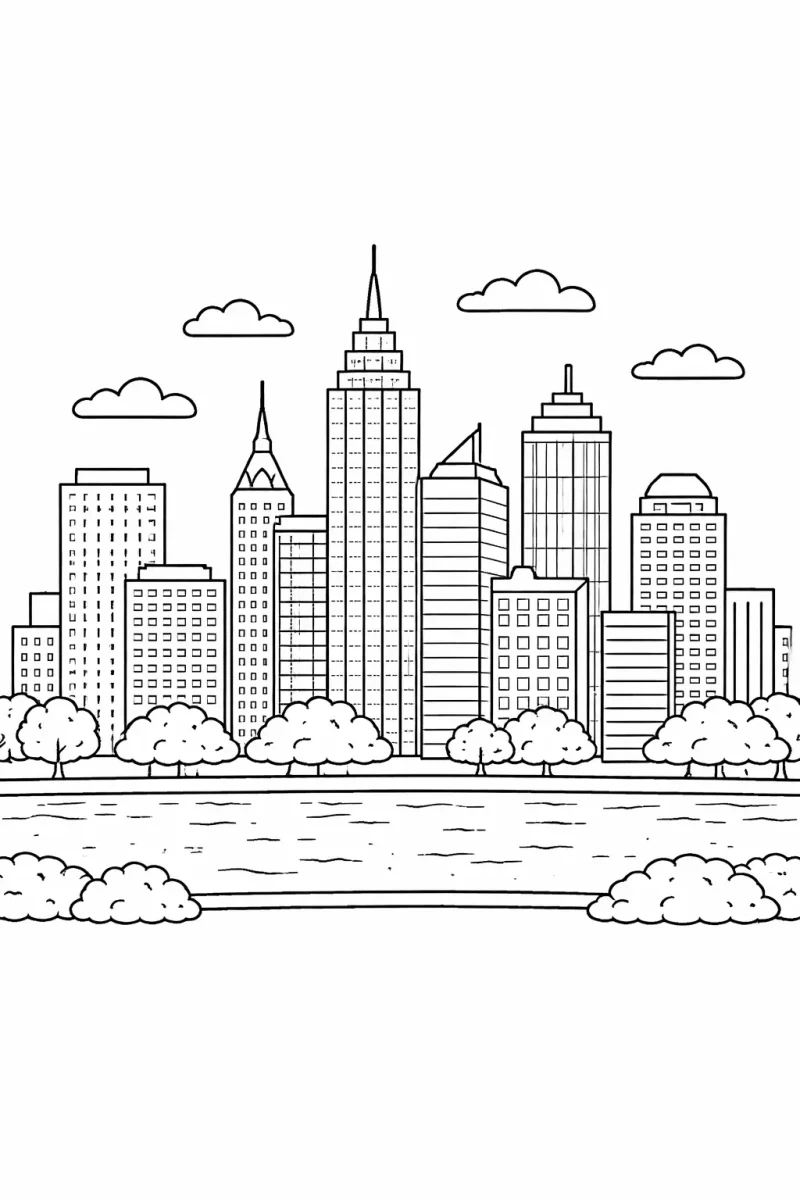 Diese Ausmalvorlage einer Stadtsilhouette bietet einen schönen Blick auf hohe Wolkenkratzer und moderne Gebäude in einem einfachen und ansprechenden Stil. Die Illustration zeigt eine klassische städtische Skyline mit unterschiedlichen Gebäudeformen, was das Ausmalen spannend und interessant macht.
