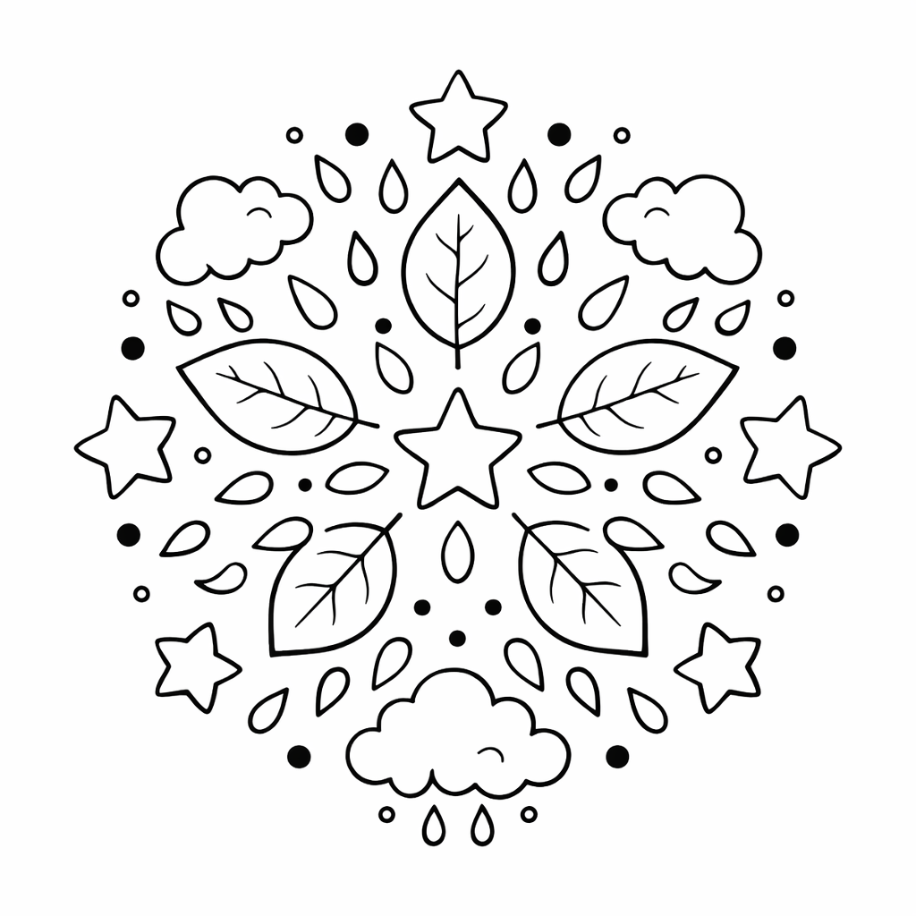 Dieses Mandala mit natürlichen Formen wurde speziell für Kinder geschaffen, die ruhige und harmonische Ausmalbilder lieben. In der Zeichnung sind Blätter, Wolken, Sterne und Tropfen kombiniert, die verschiedene Elemente der Natur symbolisieren und ein Gefühl von Weichheit und Rhythmus erzeugen.