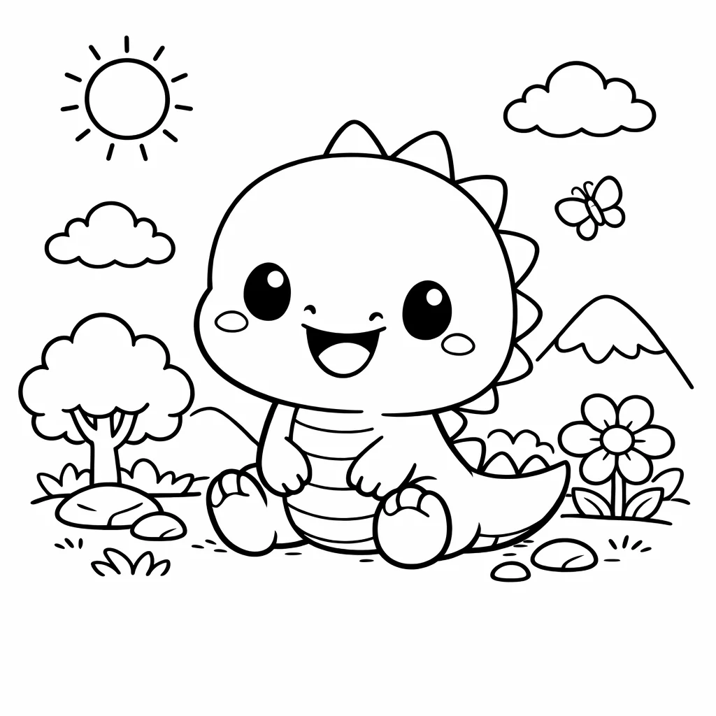 Diese Malvorlage zeigt einen lächelnden Dinosaurier in der Natur. Die Zeichnung ist freundlich und für Kinder geeignet.