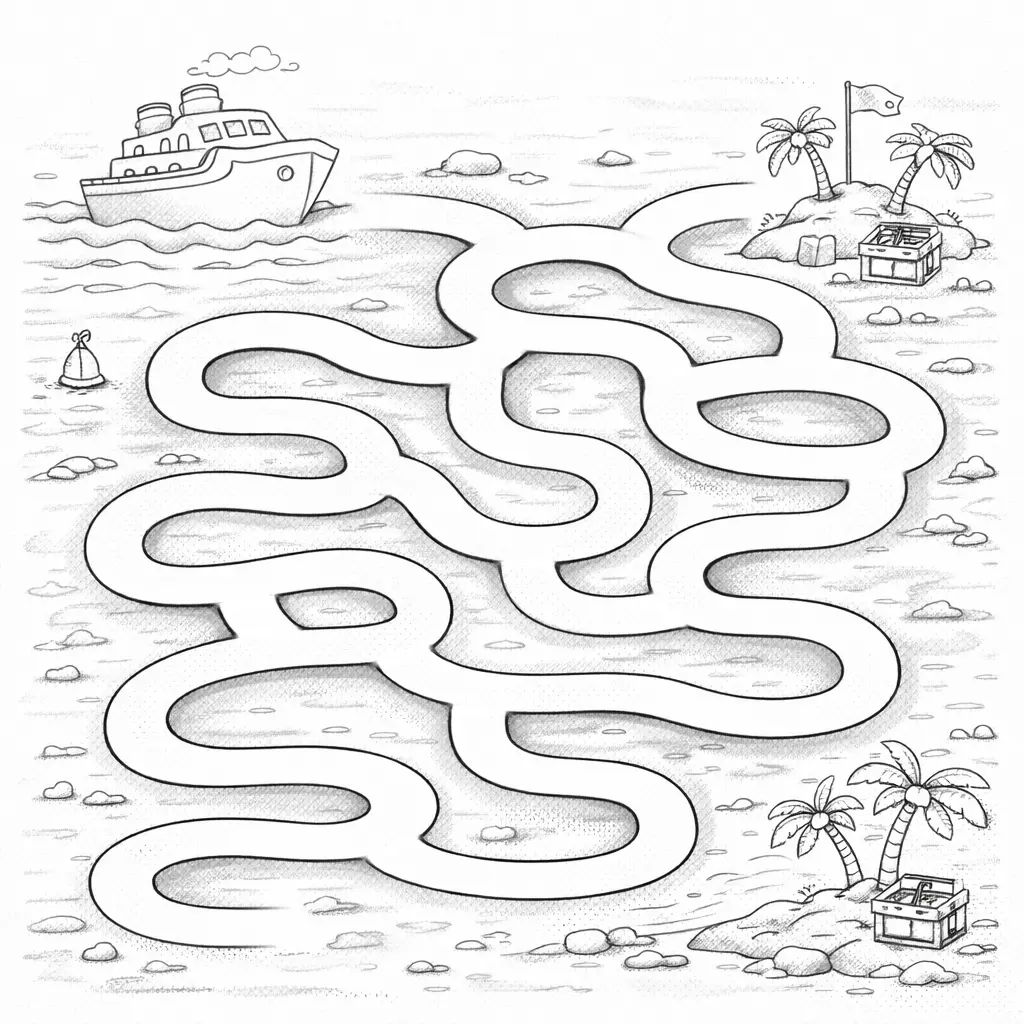 Das Labyrinth mit dem Schiff zur Insel bringt eine maritime Stimmung und eine unterhaltsame logische Aufgabe. Die Kinder verfolgen den Weg des Schiffes durch die Wellen und färben das Bild in frischen Meeresfarben aus.