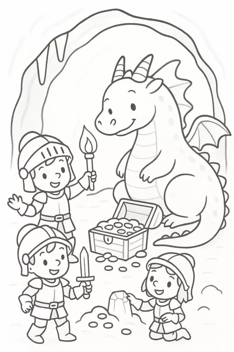 Knights Explore a Cave with a Dragon and Treasure * Printable Picture » Zumipic | Zumipic