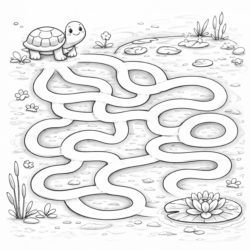 Esta imagen combina un simple laberinto con una escena agradable: una tortuga sonriente junto a un pantano con una hoja de barco y un nenúfar. Ideal para una actividad relajante para los niños y para entrenar la lógica. Cuando lo imprimas, intenta usar lápices para sombrear el dibujo y marcadores para contrastar los detalles. Para el caparazón de la tortuga, use diferentes tonos de verde y marrón, y para el agua, transiciones suaves de azul a turquesa. El lirio y las flores circundantes cobrarán vida en rosa y blanco, y los bordes del laberinto se pueden delinear con un marcador fino para una mejor visibilidad. Si buscas más tareas similares, consulta la colección de laberintos imprimibles y consulta todos los temas disponibles en el sitio aquí: todos los temas. Consejo: para los niños más pequeños, recorte una versión imprimible y pídales que sigan el rastro con el dedo antes de colorear. Para los más grandes, agregue un fondo de guijarros y juncos para obtener una escena más realista.