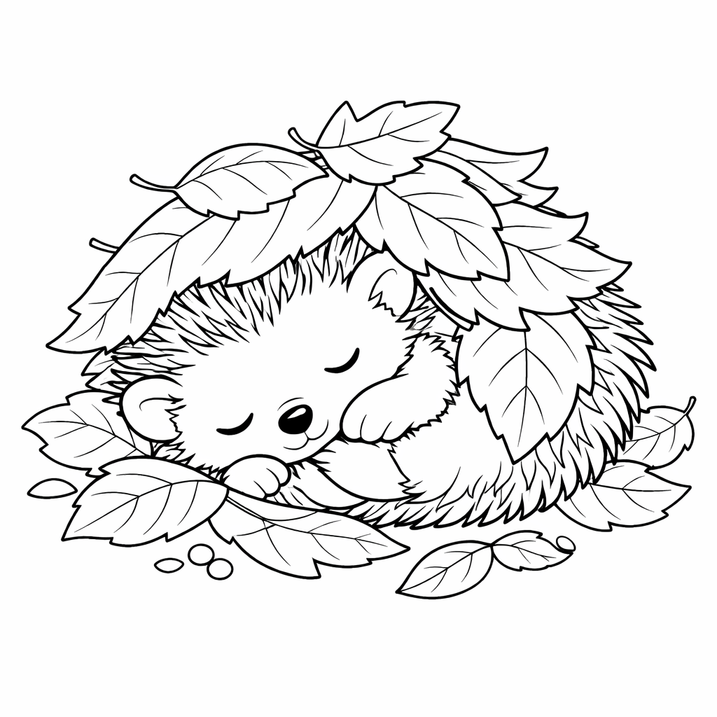 Cette page de coloriage mignonne avec un hérisson endormi, enroulé dans des feuilles d’automne, a été spécialement créée pour les enfants qui aiment les illustrations calmes et douces. Le hérisson est un petit animal forestier qui attire facilement l’attention des enfants avec sa forme et ses piquants, et les feuilles d’automne créent une sensation de confort et de chaleur.