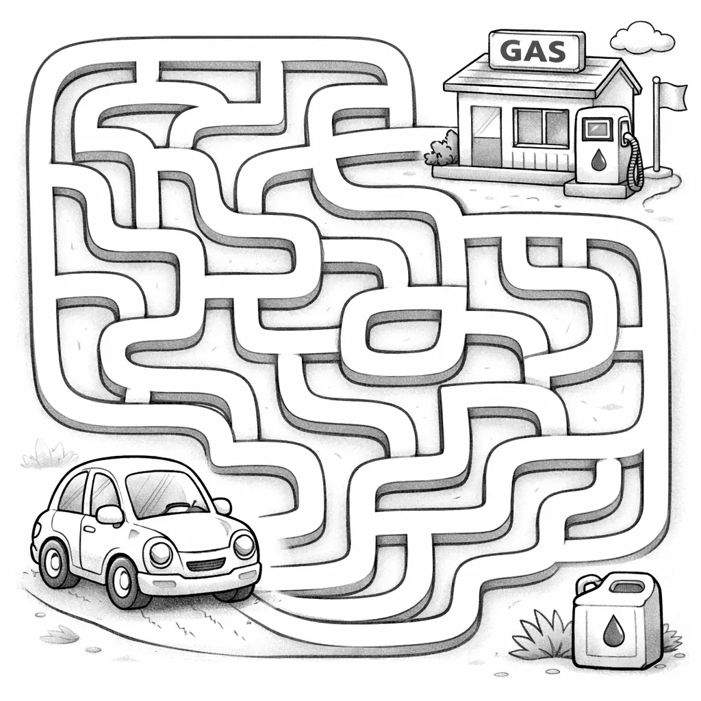 Labyrinthe avec une voiture et une station-service - une image amusante à colorier et à trouver son chemin » Zumipic | Zumipic