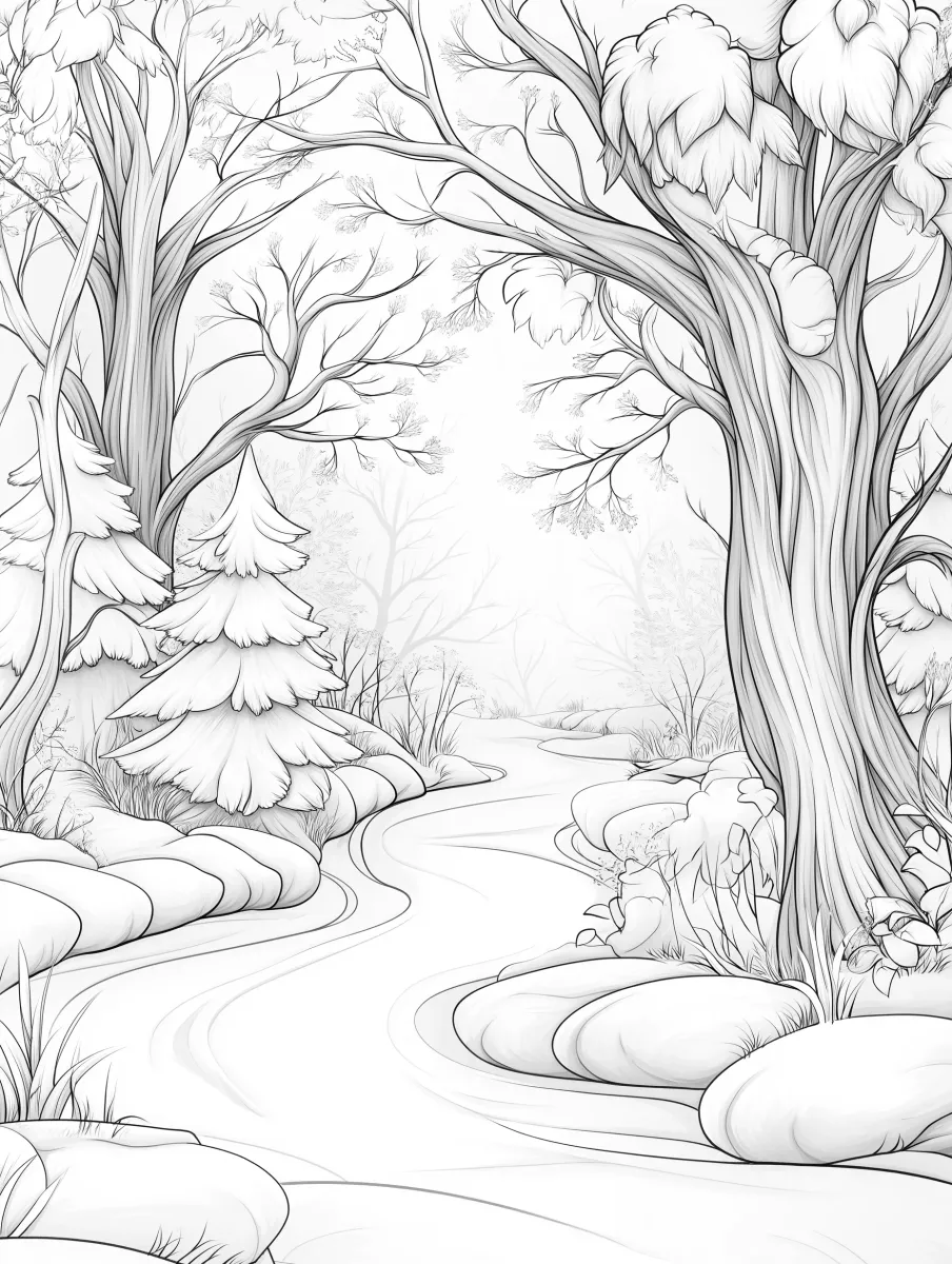 Page de coloriage d'une forêt en hiver » Zumipic | Zumipic