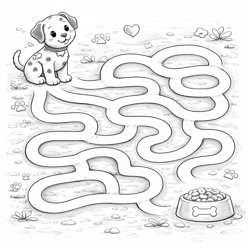 Questa adorabile immagine unisce un divertente labirinto e un simpatico cucciolo: perfetta per i bambini che amano le sfide e i colori. Aiuta il cucciolo a trovare la ciotola del cibo tracciando il percorso e poi colorandolo con toni vivaci. Per lo sfondo, usa pastelli più chiari o sfumature di grigio per far risaltare le zampe, le impronte e il cuore in alto. Accentua le macchie del cucciolo con colori più scuri e aggiungi texture con linee o punti che si intersecano. La ciotola può essere brillante, rossa o blu, per contrastare con lo sfondo terroso.