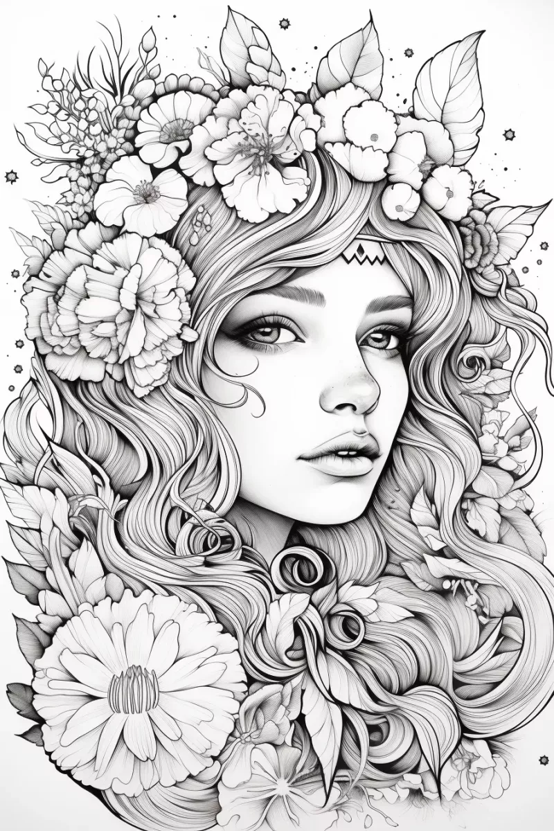 Pagina da Colorare per Adulti di una Bella Ragazza con Fiori nei Capelli » Zumipic | Zumipic