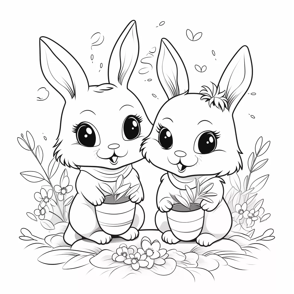 Pagina da Colorare Stampabile di 2 Coniglietti che Tengono Vasi con Fiori » Zumipic | Zumipic