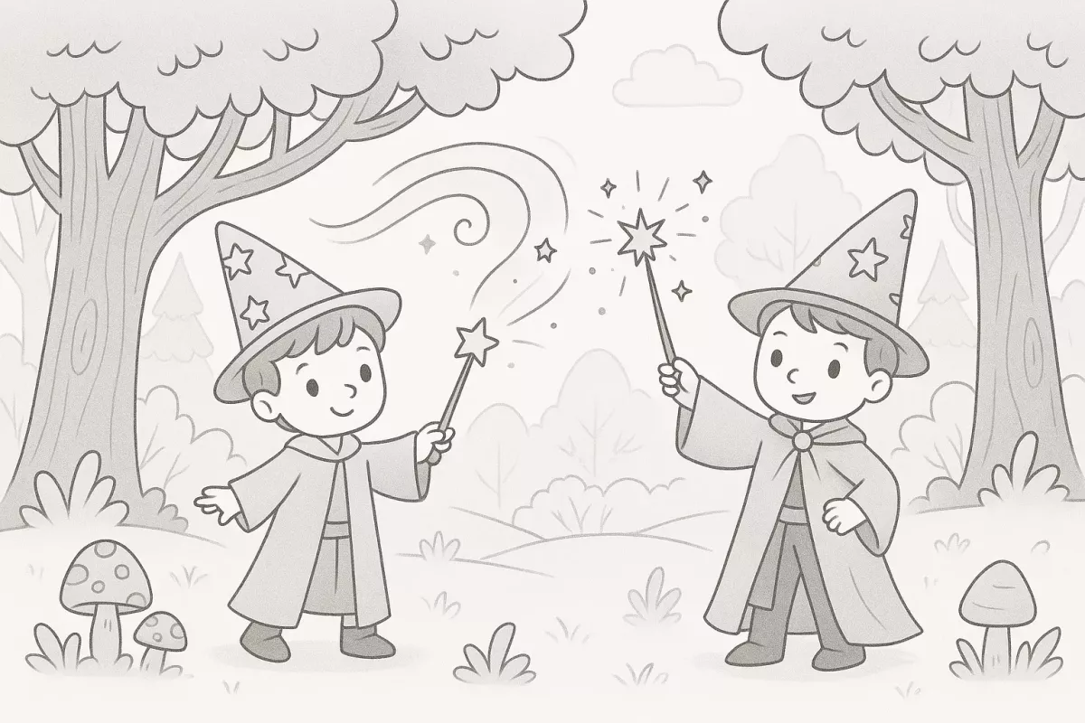 Pagina da Colorare Stampabile di Una Foresta Magica con Maghi che Fanno Incantesimi » Zumipic | Zumipic
