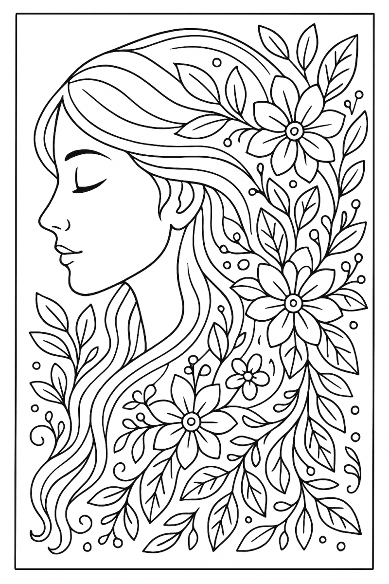 Floral Saç Akışı – Zihinsel Sakinlik ve Rahatlama İçin Boyama Sayfası